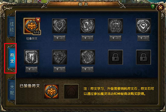 1、开放条件:角色等级到达35级开放符文系统。不同职业可学习的符文不完全相同,每个职业只能学习指定的符文。