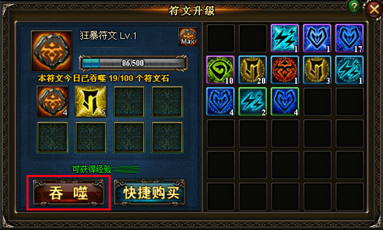 2、符文系统未开放之前所遗留的消耗类符文,都可以通过“符文升级”进行吞噬,转化为当前符文升级经验。