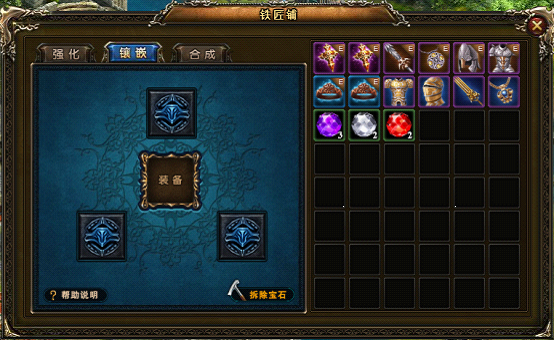 当玩家达到16级,即在铁匠铺中开放镶嵌功能,可以将宝石镶嵌在有孔的装备上。