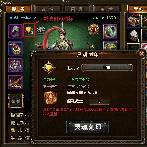 点击“人物装备”界面的“灵魂刻印”图标,可以进行灵魂刻印操作,灵魂刻印会消耗物品“灵魂水晶”。