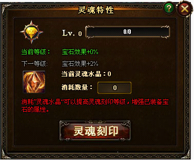 2、通过消耗灵魂水晶进行灵魂刻印操作,可以获得灵魂刻印经验(每消耗一个灵魂水晶提升一点经验),进而提高灵魂刻印的等级,随着灵魂刻印的等级提高,宝石的加成效果会得到增强。