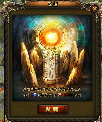 玩家可以花费一定的钻石,获得一定的战魂,是玩家快速获得战魂的一种方式,玩家每日最多能使用聚魂功能20次。