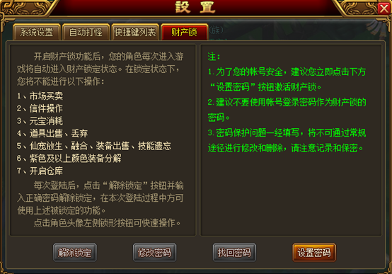 d.激活财产锁后,使用受保护的功能时需要密码验证,且每次刷新或下线时,财产锁自动上锁,保护重要财产的安全