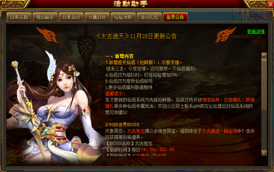 40级以上修士在更新后首次登录时,系统自动弹出游戏内置版简易更新公告,方便所有修士及时了解更新内容;也可随时打开【活动助手-更新公告】界面查看。