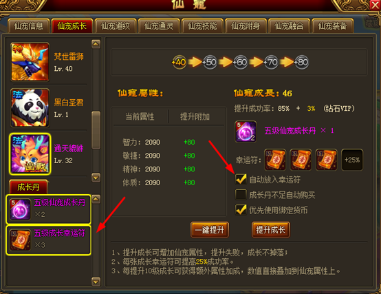 (1)选中目标仙宠后,可在左下角直接查看所需等级的成长丹和幸运符数量