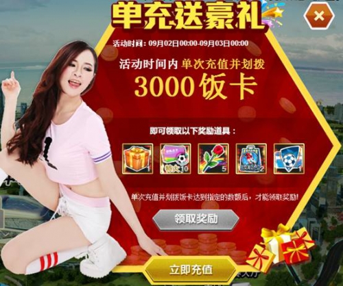 活动内容:活动时间内,单次充值划并划拨到达指定饭卡数:3000饭卡,即可在活动中领取珍稀的豪华道具