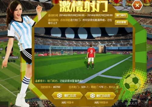 活动内容:活动时间内,通过参与激情射门活动,即有机会获得珍惜道具:俱乐部升级卡,降薪卡,卡洛斯碎片等,射门到达指定次数,即可进入排行榜,排行榜中有丰厚大奖等你拿哦!