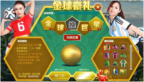 活动内容:活动时间内,通过参与“金球豪礼”活动,可以获得珍贵C.罗纳尔多专属装备,在获得道具的同时还有机会获得字符,字符可以用来兑换巨星哦!拥有五个字符,即可兑换指定橙色巨星!还在等什么,快快参加吧!