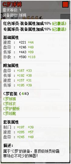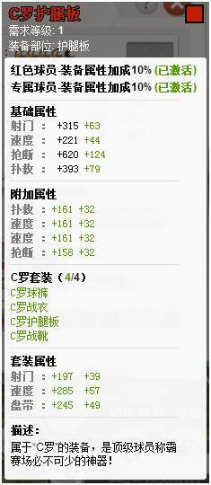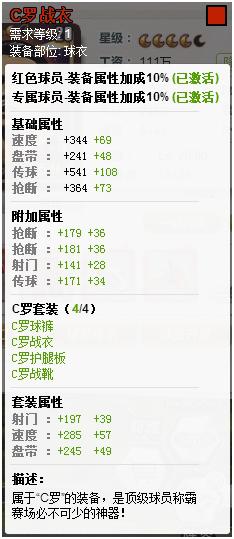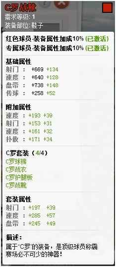 当集齐C罗四件装备时,将会激活套装属性,套装属性也会有额外加成的哦!