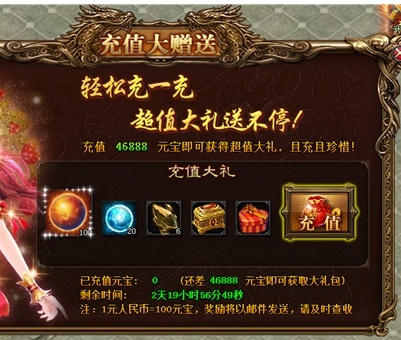 轻松冲一冲,超值大礼送不停,只要在活动期间累计充值达到46888元宝,即可领取“喜大普奔”坐骑提升豪礼一份!