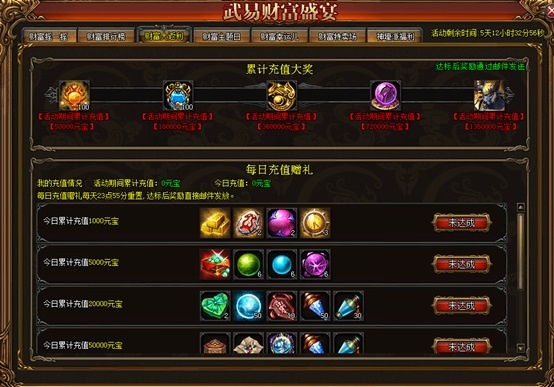 活动详情:活动期间,玩家累计充值达到指定元宝,可以获得对应等阶的奖励;每日充值达到指定元宝,也可以获得每日充值赠礼的道具。每天23点55分重置昨天的数据,两类奖励达标后自动邮件发送。