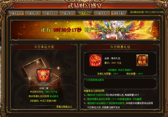 活动详情:活动期间,每天本服会有限量出售的100个特惠礼包,玩家购买特惠礼包可以获得一个1-100的幸运数字,每个幸运数字都不会重复。每天21点整,会抽出本服的中奖数字,拥有这个中奖数字的玩家,可以获得今日的幸运大奖!
