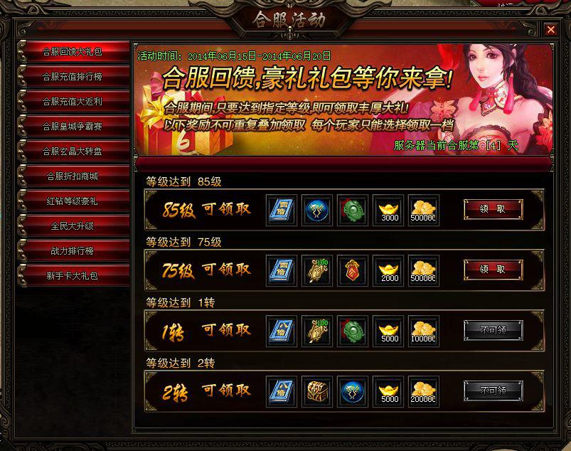 合服礼包升级,根据玩家等级,可以选择领取一档最适合玩家的礼包,注意,每次合区只能领取一次礼包。