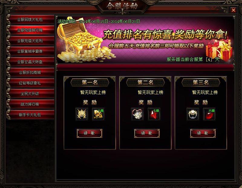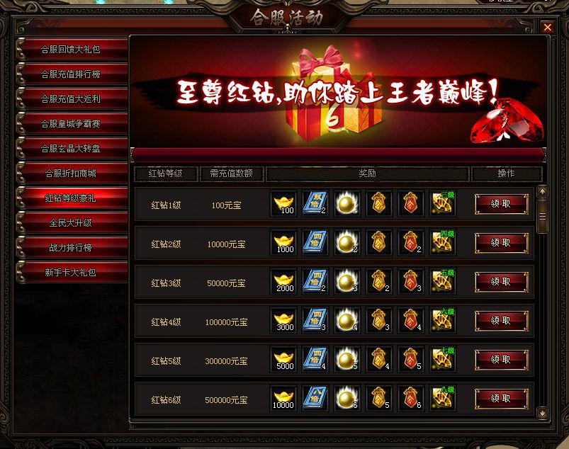 在新区中未来得及领取的红钻礼包,合区后可以领取了。