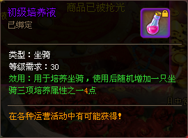 【规则】玩家可花费8元宝购入原价15元宝/每瓶的【初级坐骑培养液】。