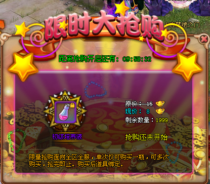 3.全区全服限量1999瓶,不限购买量,在活动时间内,售完为止!未售完的物品,将在活动时间过后下架。