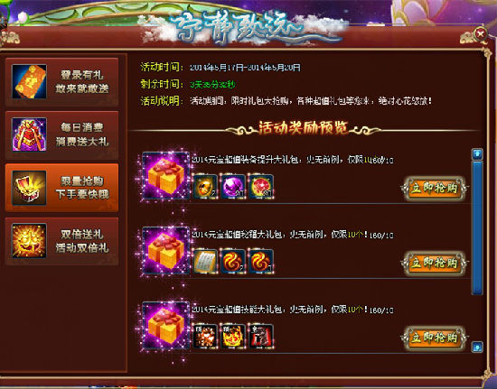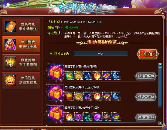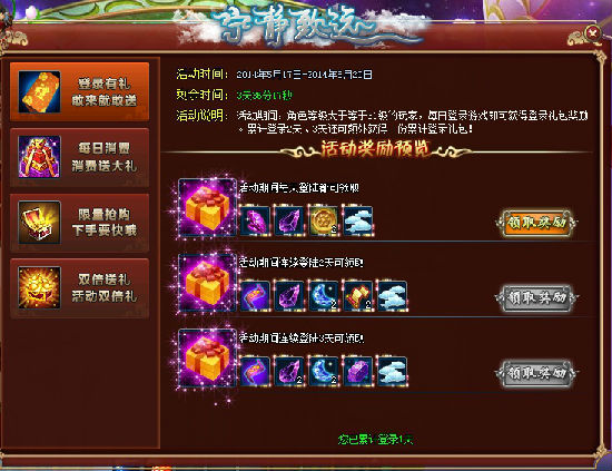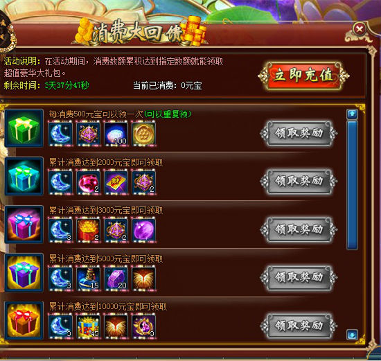 【活动说明】:活动期间,玩家消费数额累积达到指定数额就能领取超值豪华大礼包,您还在犹豫什么呢!