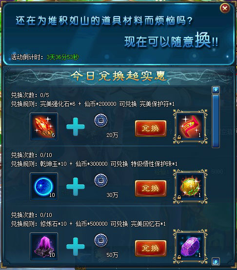 【活动说明】:还在为堆积如山的道具材料而烦恼吗?现在可以随意换!!