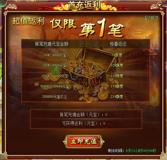 【活动说明】:活动开启后,玩家首笔充值达到指定金额即可获得对应返还比例的非绑定元宝(奖励通过邮件发送)。此活动只针对第一笔充值,如果首笔充值不满足任意一项条件,活动将直接结束,再次充值将不会获得返利。未领取奖励的玩家将于当天24点通过邮件发送奖励。