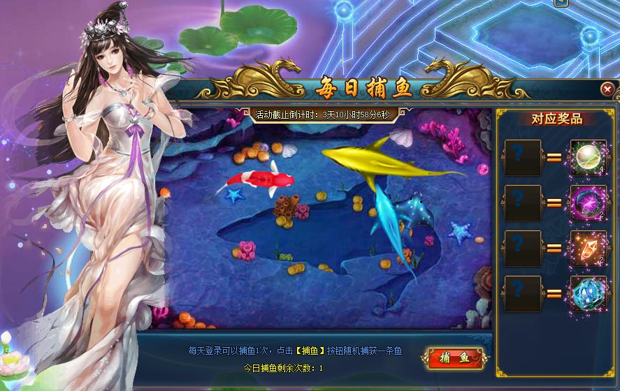【活动内容】:活动期间,每日登陆即可捕鱼哦,人人100%有奖。