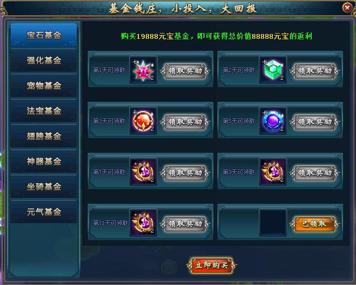 【活动内容】:活动期间内,每位玩家都可在基金钱庄中购买不同的基金。小小投入,大大回报,还有超多选择,快来投资基金吧。