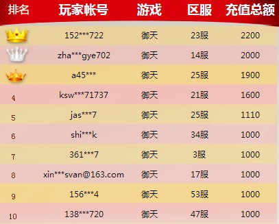 以下为游戏排行榜活动第一天获奖名单公示,所有活动奖励将在活动结束后3个工作日内发放。