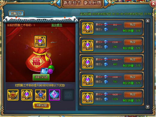 活动说明:1、活动开始期间,根据玩家的图腾之术等级,生成若干限购豪华超值礼包。