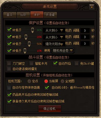 通过快捷键Z或点击主界面右下方的挂机设置按钮,就可以打开挂机设置界面。