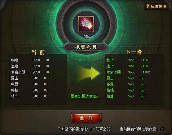 3、每个幻翼在飞升时需要消耗指定数量的幻翼之羽,数量不足不能提升幻翼的飞升等级;