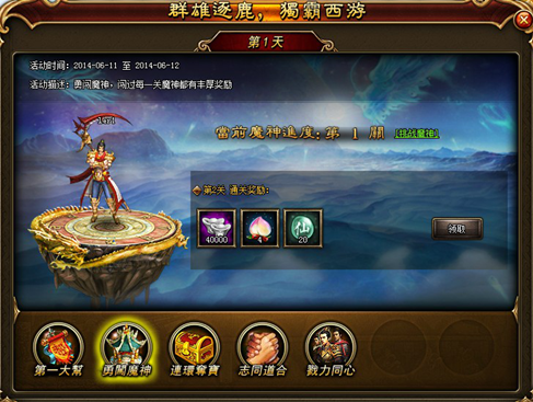 2.勇闯魔神:帮派成员通关指定的魔神关卡可获得奖励。