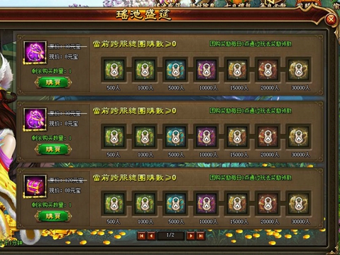 动内容:玩家每日可购买瑶池盛筵中开放的礼包道具各1个,购买后将累计计入该道具的跨服团购人数,单个礼包购买的人数越多且达到指定的数量,所有在今日购买过的该礼包的玩家,都可以在0点结算后获得相应的团购奖励!