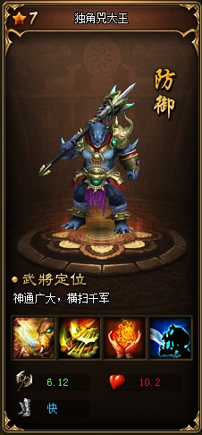 横扫千军(主动):攻击敌方前排全体目标,回复自身生命值,同时提升自身防御力3回合。