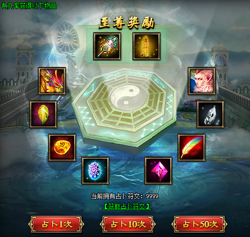 活动说明:玩家可消耗占卜符文摇动乾坤卦(可在商城购买乾坤宝箱开启赠送),可在乾坤卦中有几率获得至尊双属性宝物、宝石、符石、宝石封灵石、符石封灵石、宝物封灵石等。