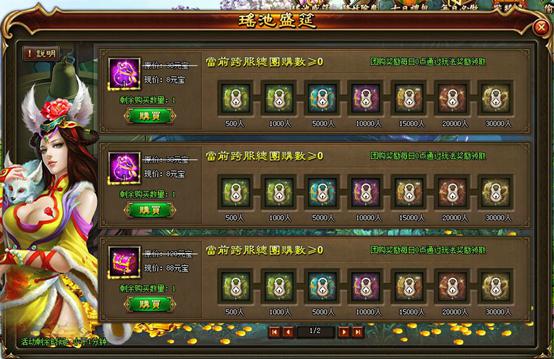 动内容:玩家每日可购买瑶池盛筵中开放的礼包道具各1个,购买后将累计计入该道具的跨服团购人数,单个礼包购买的人数越多且达到指定的数量,所有在今日购买过的该礼包的玩家,都可以在0点结算后获得相应的团购奖励!