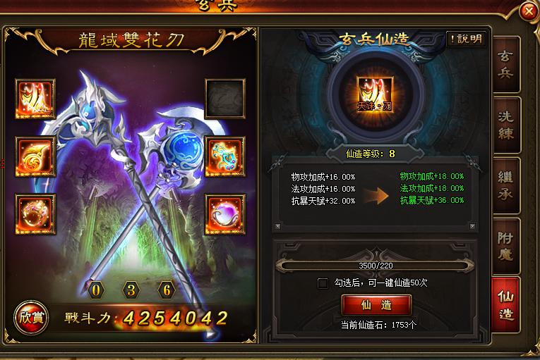 5.玄兵仙造提升的属性可在所有玩法中生效。