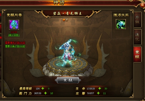 14.当神将升到8星时,可以进行神将的觉醒,觉醒将在一个单独的觉醒界面进行,消耗材料成功觉醒后,神将除了获得额外属性,还将获得一个新的主动技能和新的炫酷称号!