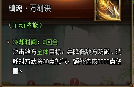 镇魂·万剑诀可攻击敌方全体目标,并降低敌方防御、降低对方主角30点怒气,额外造成3000点伤害。该技能冷却时间为2回合。