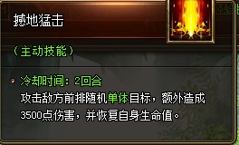撼地猛击可攻击敌方前排随机单体目标,额外造成3500点伤害,并恢复自身生命值。该技能冷却时间为2回合。