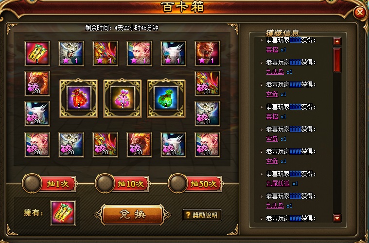3、抽取百卡箱有几率获得“百卡券”,使用百卡券可进入百卡箱兑换界面兑换不同的天赋卡奖励。
