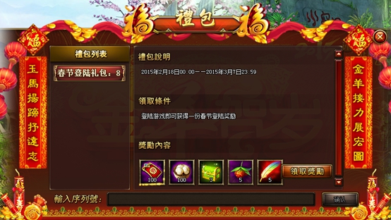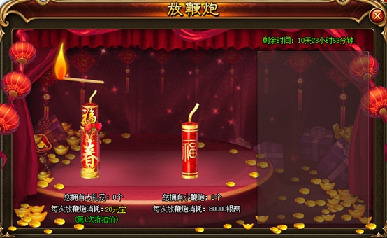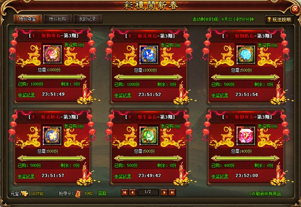活动规则:玩家可在‘彩礼闹新春’界面花费一定元宝购买彩券号码,可根据自己想要的道具购买专属礼券,在道具所需礼券销售完后,便开始进行抽奖,10分钟后开始发放奖励。