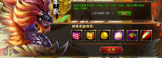 活动说明:活动期间内,在火焰山场景中会定时出现年兽,玩家前往击杀年兽可获得丰厚奖励。