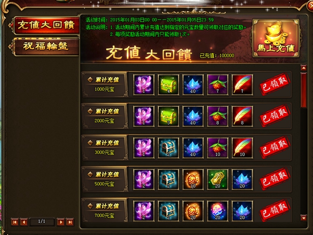 1. 活动期间每日累计充值元宝>=10000 可领取对应奖励。