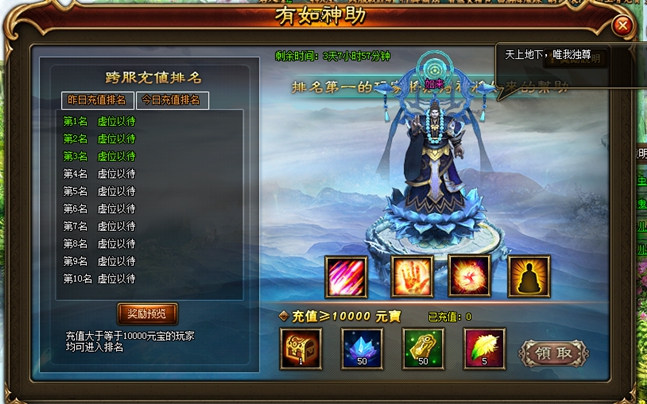 2. 活动期间每日累计充值元宝>10000元宝,且总数排名前10的玩家可领取更高奖励。