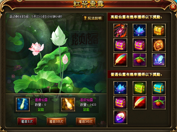 2. 红荷垂露活动开启期间内,副本、降妖除魔掉落普通仙露;