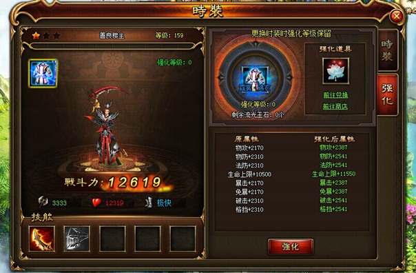 4) 强化加成:时装可强化,强化等级共50级,需要消耗道具流光玉石。每次强化成长基础属性的百分比系数,强化等级越高加成系数越大。