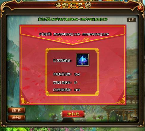 4.抢红包的时间限制为1小时, 1小时后本轮活动结束,本轮时间结束后玩家不能再抢,直到下一轮活动开始方可参与5.每一轮抢红包次数无限制,所以每一个玩家可多次抢红包,直到所有的红包被抢光,或者本轮时间结束。