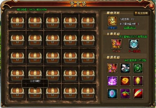 活动说明:活动期间内,每日累计充值元宝达到指定额度即可获得赠送的玉帝金令,消耗指定数量的玉帝金令可开启一个黄金袋宝箱,开启25个宝箱必出至尊奖励。