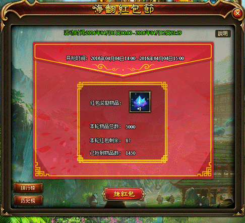 4.抢红包的时间限制为1小时, 1小时后本轮活动结束,本轮时间结束后玩家不能再抢,直到下一轮活动开始方可参与5.每一轮抢红包次数无限制,所以每一个玩家可多次抢红包,直到所有的红包被抢光,或者本轮时间结束。