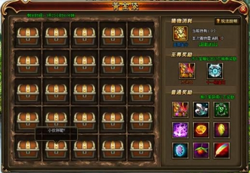 活动说明:活动期间内,每日累计充值元宝达到指定额度即可获得赠送的玉帝金令,消耗指定数量的玉帝金令可开启一个黄金袋宝箱,开启25个宝箱必出至尊奖励。