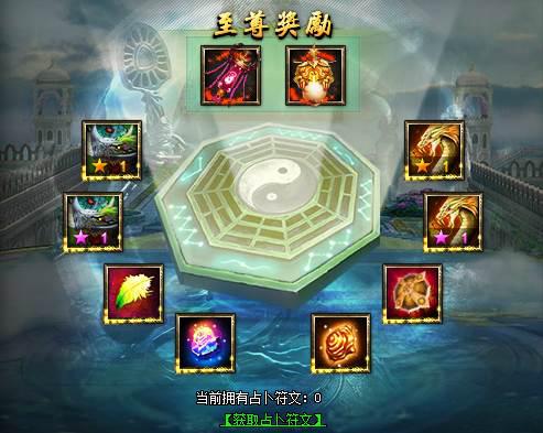 活动说明:玩家可消耗占卜符文摇动乾坤卦(可在商城购买乾坤宝箱开启赠送)活动奖励:可在乾坤卦中有几率获得至尊双属性宝物(至尊噬血灯、至尊霹雳珠)、橙色毕方天赋卡、紫色毕方天赋卡、橙色白虎天赋卡、紫色白虎天赋卡、宝石、符石、宝石封灵石、符石封灵石、宝物封灵石等。